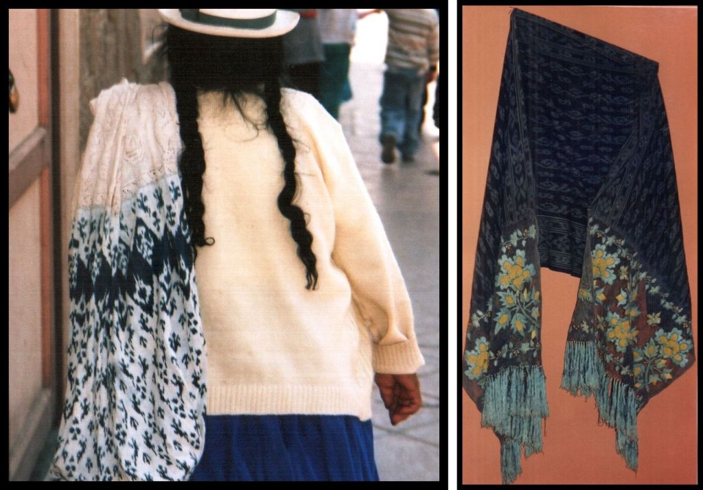 LEFT: A woman is carrying a rare old cotton ikat shawl in Cuenca. RIGHT: An ikat shawl with embroidery on a knot network fringe at the Gualaceo museum.