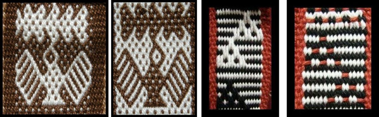 LEFT: The front and back of an Andean pebble weave motif. RIGHT: The back of a simple warp float motif reveals the red weft.