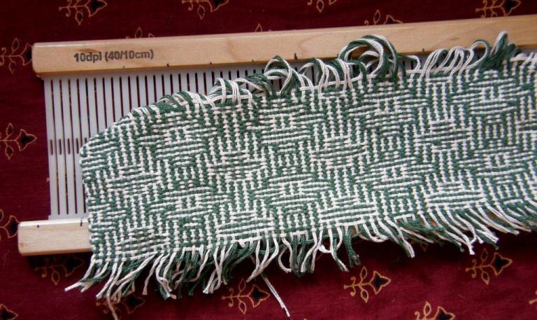 […] designs using simple warp floats. I used this design on the cell phone pouch that appeared in this previous post. I warped up this week to weave the design with the tutorial in mind. However, there were obviously […]