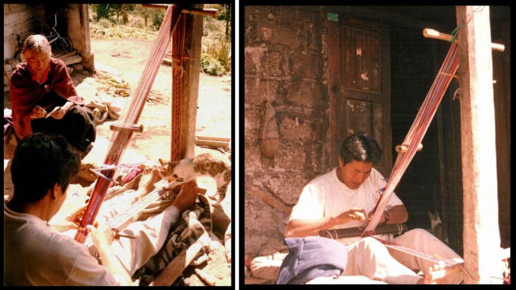 Felipe at work on his long continuous warp on his porch while his mother-in-law sits by. As usual there is a cat that wants to get into the act.