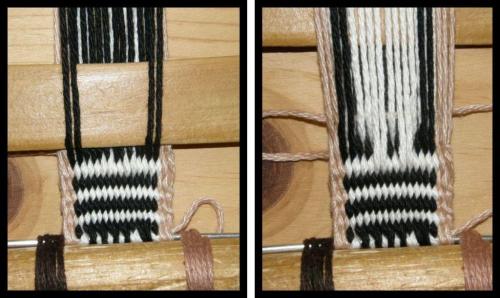 The light Shed has been opened and the dark selected warps added to it. The weft is then passed. Then you Start again, that is, open the dark shed etc etc…