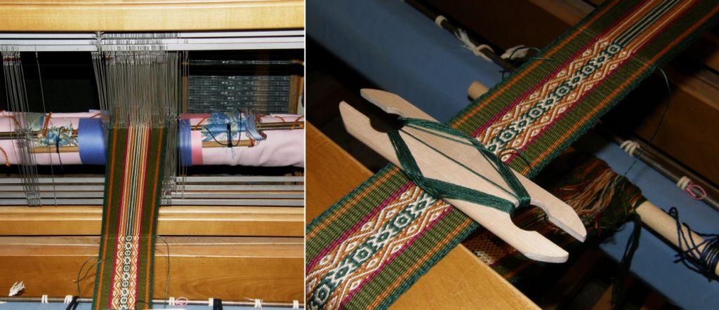 The warp in the Andean pebble weave segment of the video is the one that Maurice, Lisa and I set up on Lisa’s four-shaft loom in North Carolina. I had intended doing something a lot wider but had not anticipated the amount of warp length that was required for the four-shaft loom and so had not bought enough yarn. So I ended up with a piece that happens to be just the right width for a guitar strap and I already know a guitar player who will love it.