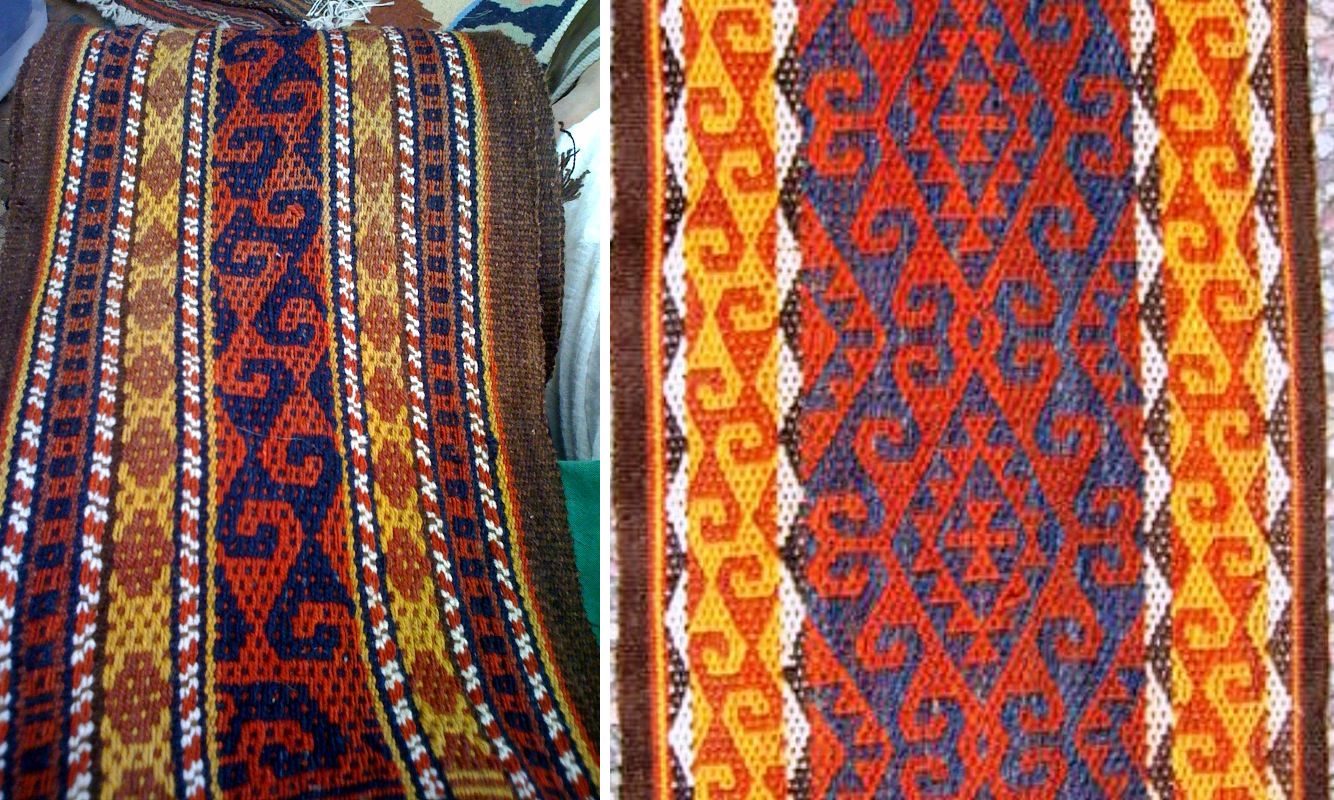 At left is a flashback to 2007 when I was with the family. I wove quite a lot of this piece as part of my “training” so here you see the two proud weavers in front of their finished work!