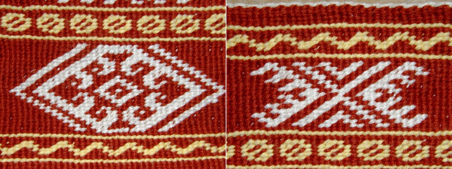 As you can see above, the resulting “stitches” are slanted which means that diagonal lines in the design take on a different appearance depending on which way they are slanting. I thought at first that I must be doing something wrong but a close inspection of the Montagnard pieces showed that their designs have exactly the same appearance.