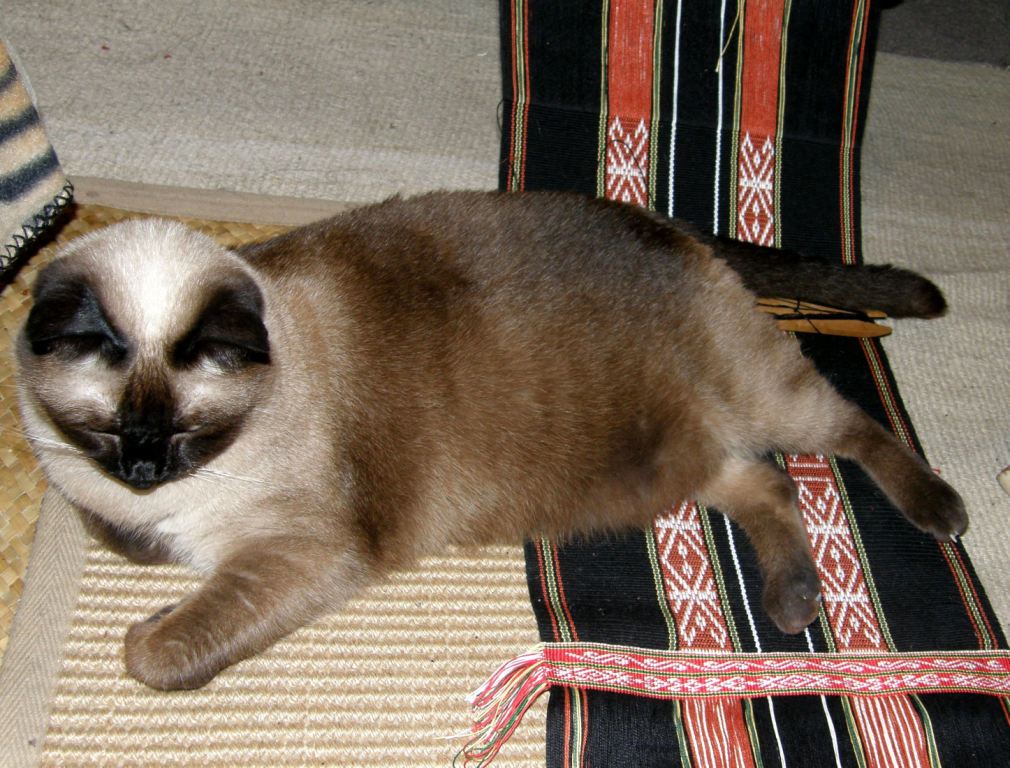 I love the backstrap. Ju uses a large pad which I think is stuffed with some kind of fiber. She just passes a rope behind it to hold it to her back which she then loops around her loom bars. It is very comfortable. You can just make it out in this picture…