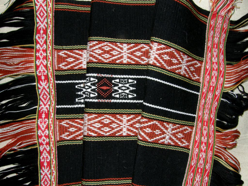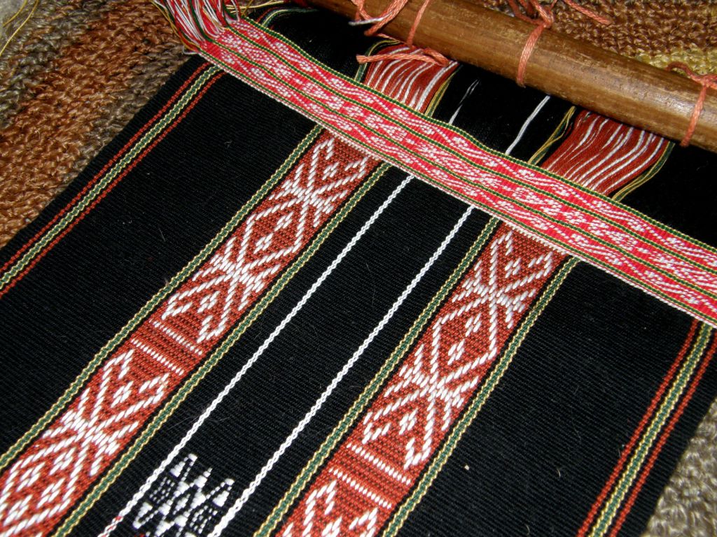 An interesting thing about the supplementary pattern on this piece…usually I don’t recommend having weft floats of less than two warp spans as they barely show up on the fabric but I had to have floats that only spanned one warp on this piece in order to faithfully reproduce the Montagnard motif and, to my surprise, the design shows up very well. My base warp and weft are number 10 crochet cotton and I used one and a half strands of embroidery cotton as the supplementary weft. The white thread for the warp floats is number 3 crochet cotton and the twining was done with number 20.