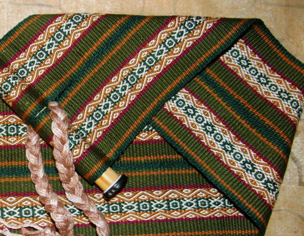 It started off as an experiment on my friend Lisa’s four-shaft loom. I wanted to weave a long Andean pebble weave piece after having made only tiny sample bands in order to put the draft together for my Andean Pebble Weave book.  It came home with me to Santa Cruz and went onto my backstrap loom to be finished…