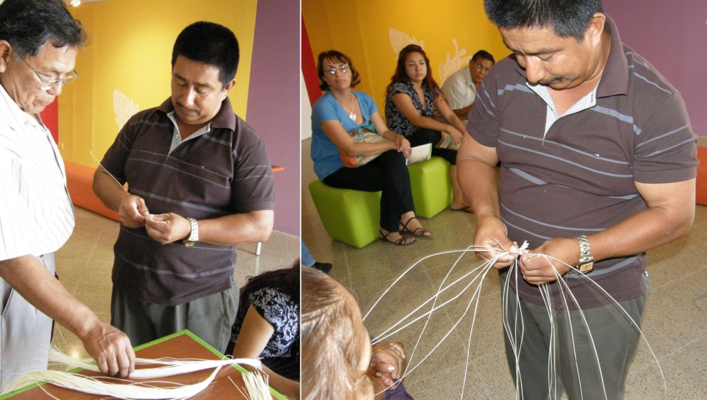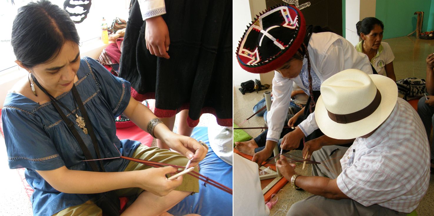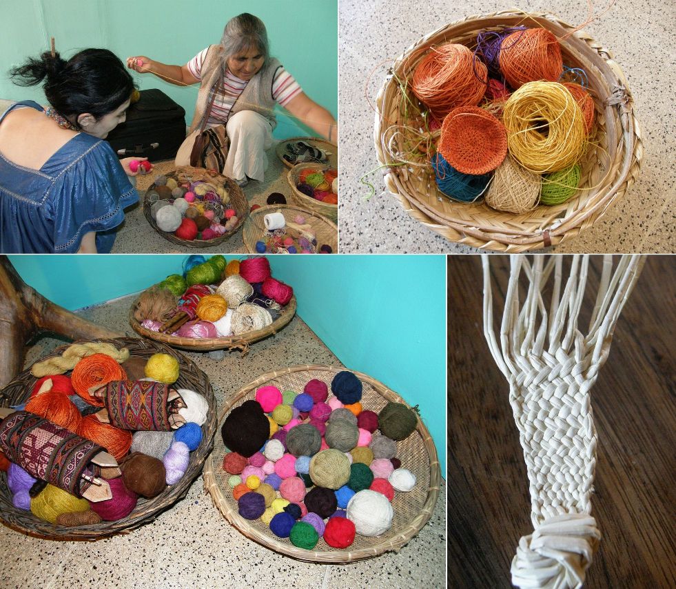 Domingo, a master weaver of the famed Panama hats of Ecuador brought the straw “paja toquilla” (above lower right) from which they are made. Maritza, from Colombia taught us how to work with the “cabuya” fiber that is extracted from the penco plant. (above upper right).