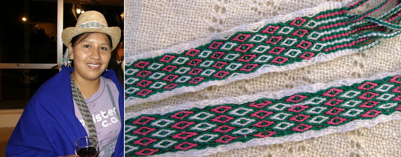 Two of Angela’s new skills…weaving straw and weaving a triple color band. The afternoons of this conference were reserved for interaction between the artisans and, that afternoon, Angela spent more time with Celinda and learned her triple color technique. The Guarani weavers have a very special way of making their string heddles joined by a chain and you can see Angela’s signature heddles on this Aymara style band….two cultures joining hands in the one piece.