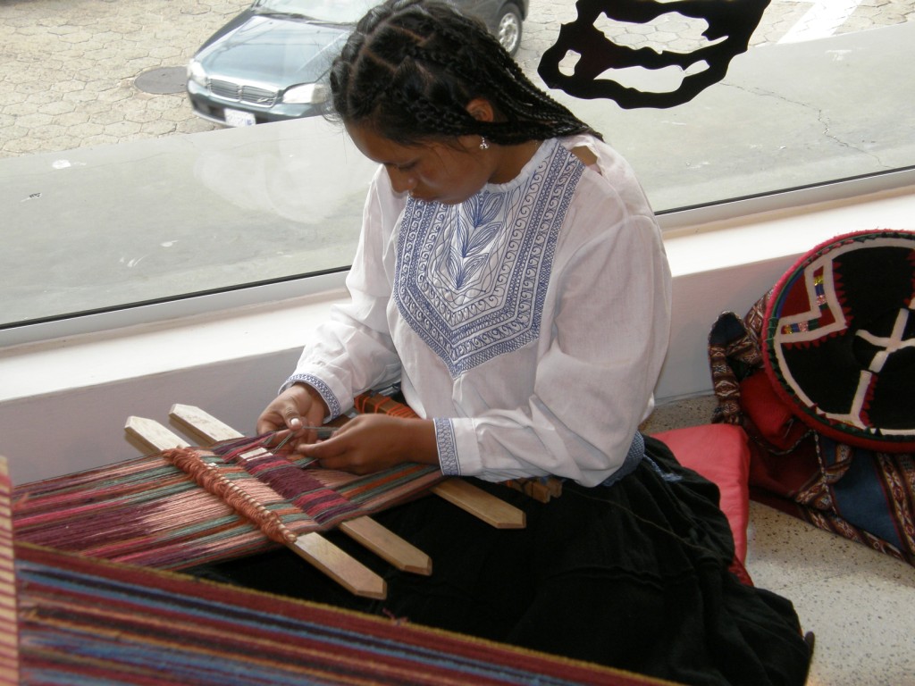 On the left is a crocheted mat I bought from the co-op, a woven bag that I was taught to make during my stay in Ecuador, and a piece I wove at home on my backstrap loom. All these colors are from natural substances.