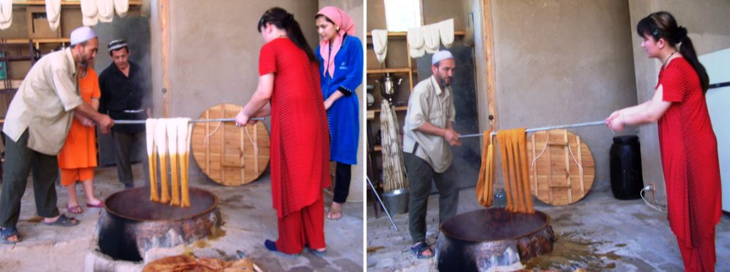 Pam also visited the UNESCO Silk Dyers’ Workshop in Taskent in 2008. In Pam’s own words…this was a project to employ women in the community using traditional arts. Note: Traditionally men are the dyers and weavers of ikat-dyed fabric (women are the cut-pile carpet weavers), but there was a lot of work in new construction in Tashkent that summer so UNESCO couldn’t get men to participate. Therefore they converted it to a project for women.
