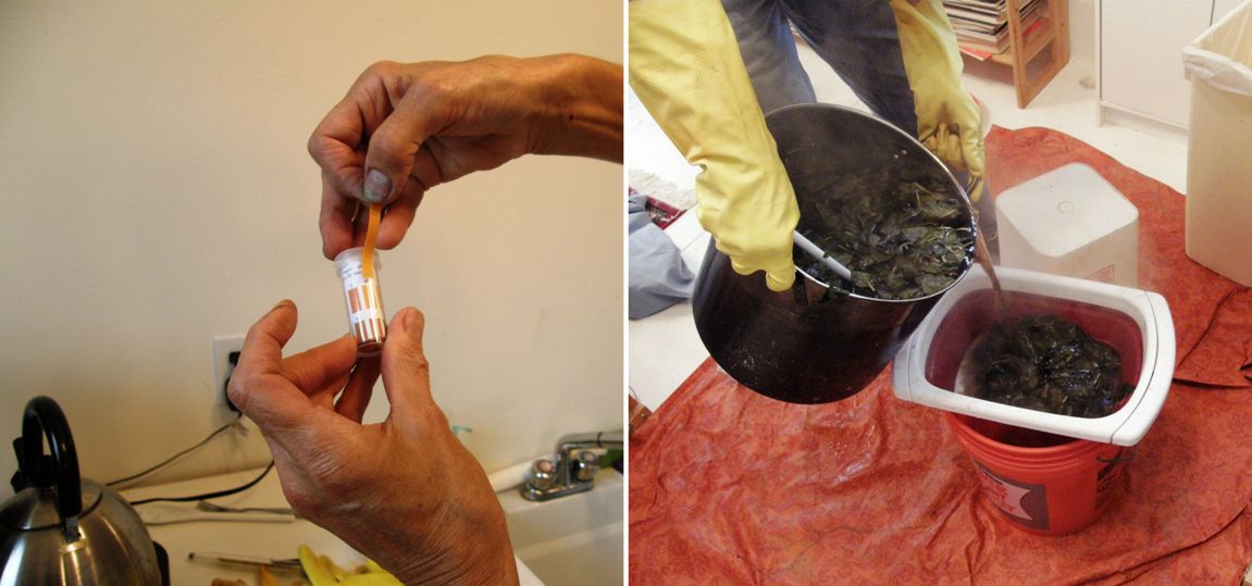 Finally, the water in the indigo leaf pot heated to the desired temperature and it was time to separate the liquid from the leaves and do a ph test.