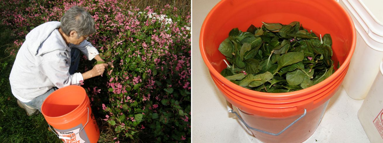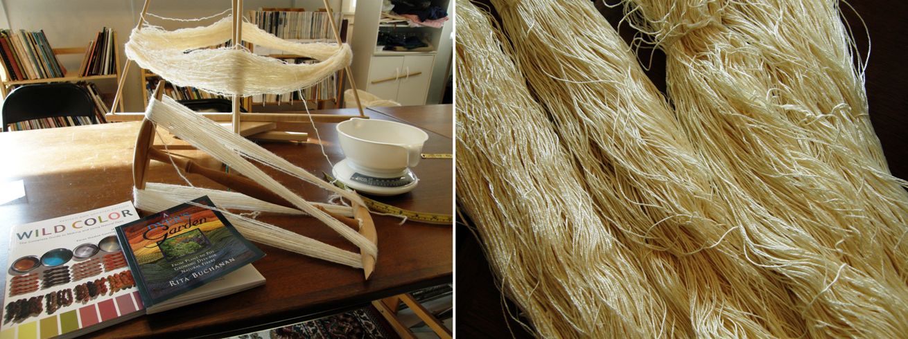 The following two days were spent harvesting Pam’s crop of Japanese indigo to dye silk and wool skeins. This would be my first time dyeing with these plants and I was very happy to have this opportunity to learn about the process. We skeined silk from Uzbekistan and wool in their natural colors and also prepared a skein of yellow wool for the pot.