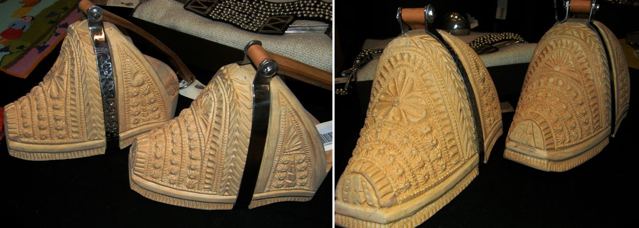 From the central zone of Chile come pieces, such as the carved wooden stirrups above, associated with the huasos, the Chilean horsemen who also use a finely woven silk poncho known as chamanto. The exhibitors brought one of the striped examples which I have been told is called manta with the name chamanto being reserved for the ones that have been decorated with pick-up patterns.