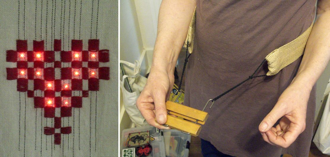 One of the interesting things that she does with her textiles is light them up. Marie calls this a monk’s belt weave with embedded electronics and she runs workshops on how to create cloth with lights. She has Swedish roots and showed me the Scandinavian-style backstrap set-up with its linen backstrap and clamping system.