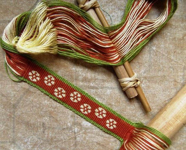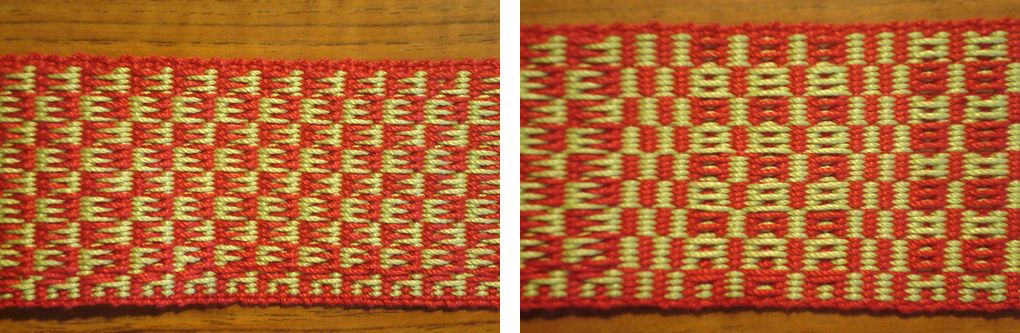 The two-color center section of the band at left is double weave alongside a plain-weave single-color border.