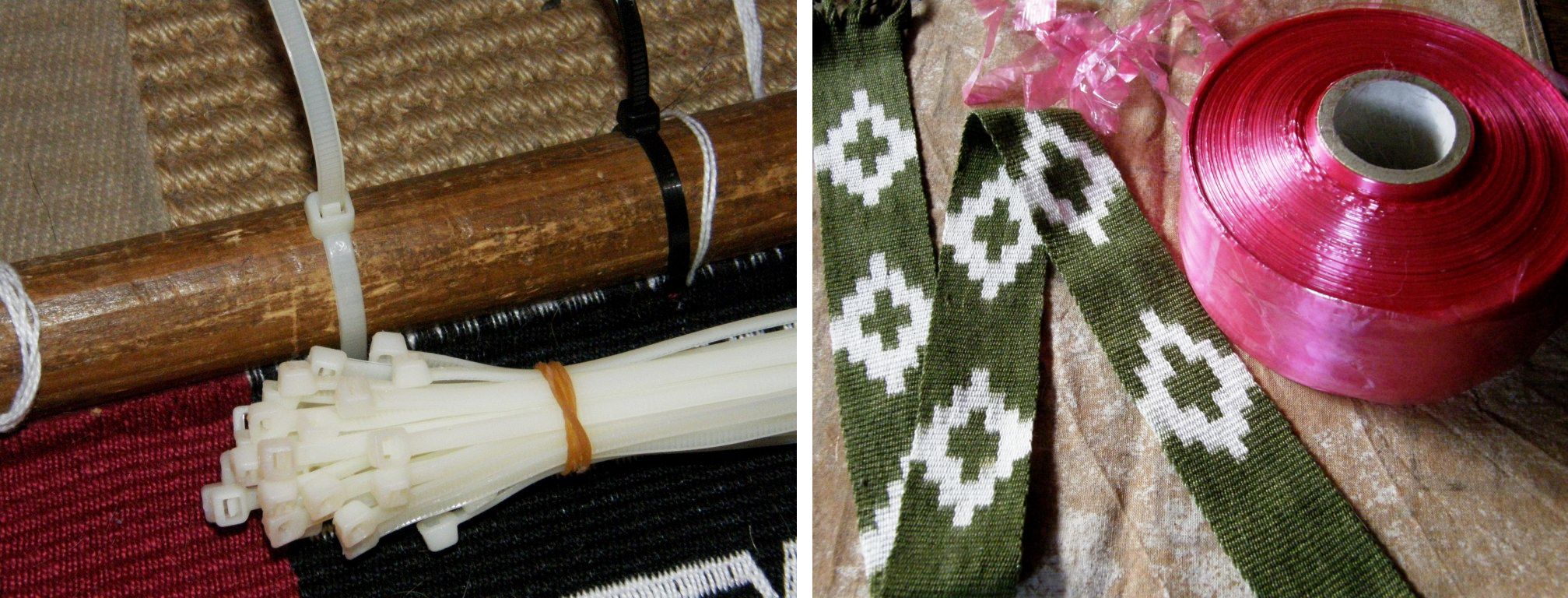 like using cable ties to lash my warp to the loom bar and a bicycle spoke instead of a yarn header cord. I was using cassette tape to wrap my warps for ikat until I was given “proper” ikat tape which seems acceptable in place of cabuya fiber and other natural materials in many “traditional” settings these days.