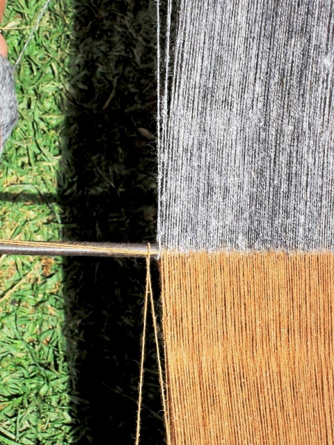This is one my favorite souvenirs of the trip… the piece on which I worked on the last day of the conference which was Workshop Day. The weaving technique is called ticlla, or, discontinuous warp, and it allows changes of color along the length of the warp.  As you can see above, the piece is divided into panels of color along its length. The white panel changes to black and the grey to brown. Both halves of the piece, that is, the grey and white and the black and brown, will be woven with four selvedges.
