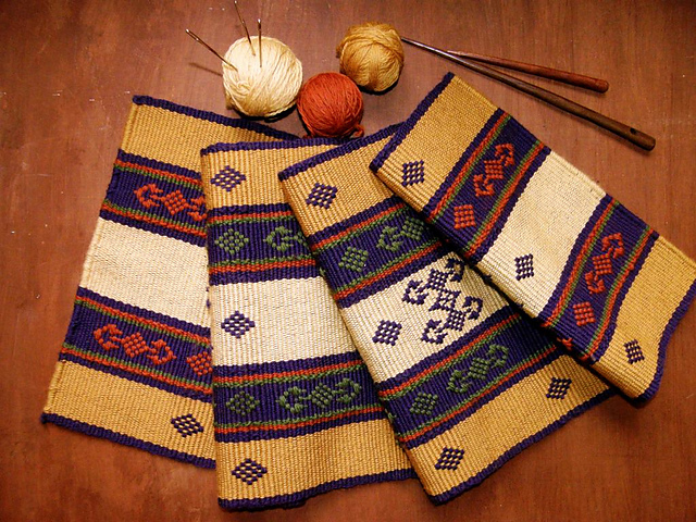 A wool plain-weave runner with four selvedges that I decorated with supplemental-weft patterns.