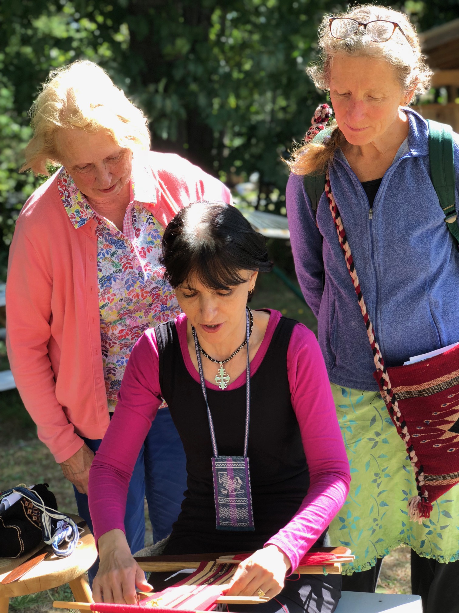 Backstrap weaving in Maine with camera at the ready. Oh yes, and there’s me letting my new silver streak shine!