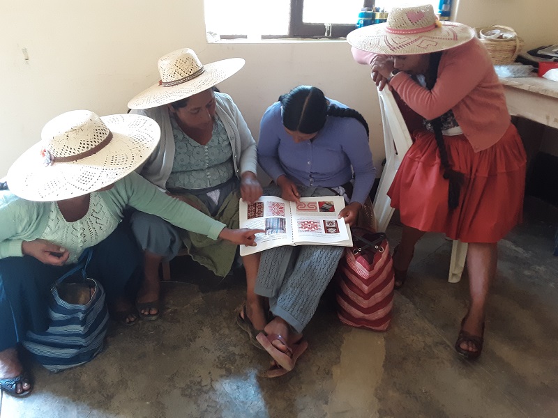 My friend Dorinda recently got back from the highlands where she had been visiting my teacher Maxima and the other ladies in the weaving co-op. The last time I was up there, the ladies were interested in the woven sample bands I had brought which had patterns that they had never seen before. They wanted to learn them and because I was only able to leave a couple of samples behind, I left behind one of my pattern books. Before I could leave, Maxima had already set up a warp and was copying one of them. On her recent trip, Dorinda took this photo of the ladies examining more patterns in the book. Just like us, they love to learn new ones.