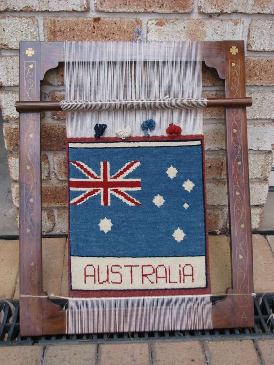 Speaking of flags and patriotic weaving, I assume that the next starry piece was made by someone who is proud to be Australian. I have this very cool cut-pile weaving of a representation of the design on the Australian flag…