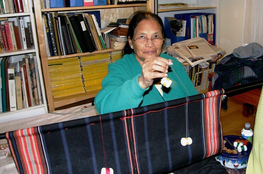 When weaving with new backstrap weavers, we even learn to be amused by the constant clatter of swords jumping out of their sheds and hitting the floor. Each sword has its own musical tone…nowhere near as much fun on a rug! A cement floor like the one in this picture greatly enhances the melody.