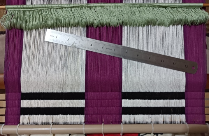 Thanks, Kelli! I have committed the 8th deadly sin by not wet-finishing this piece. It’s a nice tight weave plus I didn’t expect there to be any change in terms of improving the feel of the cotton which doesn’t feel like it has oils or other residues. It’s a very raw feeling non-mercerized cotton and the black has already spent a lot of time in hot water during my washing and dyeing process. The red was dyed with cochineal in Guatemala. Also, I haven’t laundered any of my other backstraps and figure I probably won’t do so with this one either. I did read a few blogs about rep weave and read about one weaver’s experience with losing a lot more length than she had expected. I washed the little one I wove years ago when it came off the loom but I didn’t take measurements because it really was just an experiment and size was not critical. I remember having to pull it back into shape when it was wet. It happened to fit my tray table and that was just by luck! I’d love to hear about the percentage figures that you come up with when you’re done.