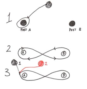 1.Start by tying the yarn in a large loop around stake A. Place the ball of yarn in a bowl or other container so it won’t roll around. Pull the yarn off the ball and lead it to and around stake B. 2.When returning to stake A, the yarn needs to cross itself. You are moving in a figure-of-eight path. 3. When changing colors cut and tie on new yarns to each other at stake A. Finish by cutting and tying off the yarn around stake A in a large loop.