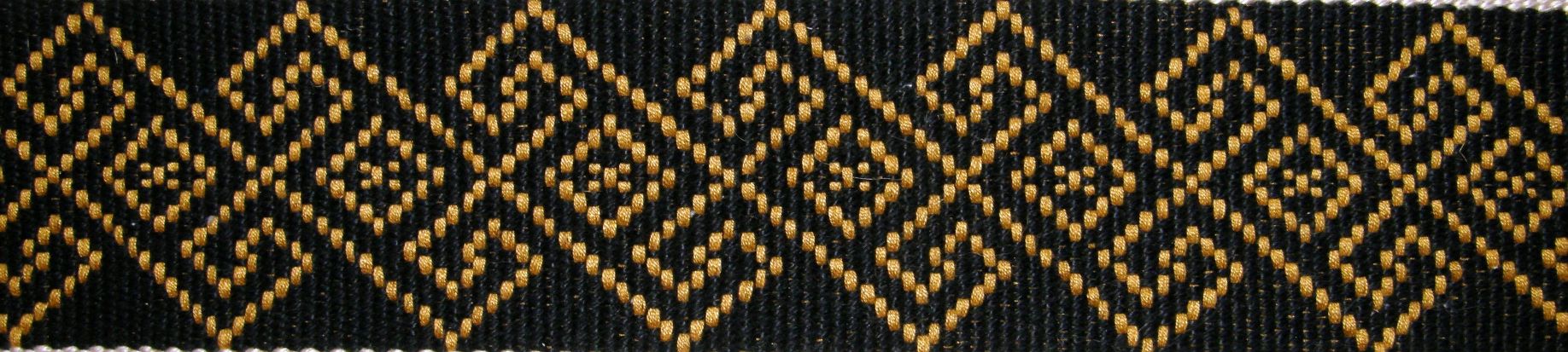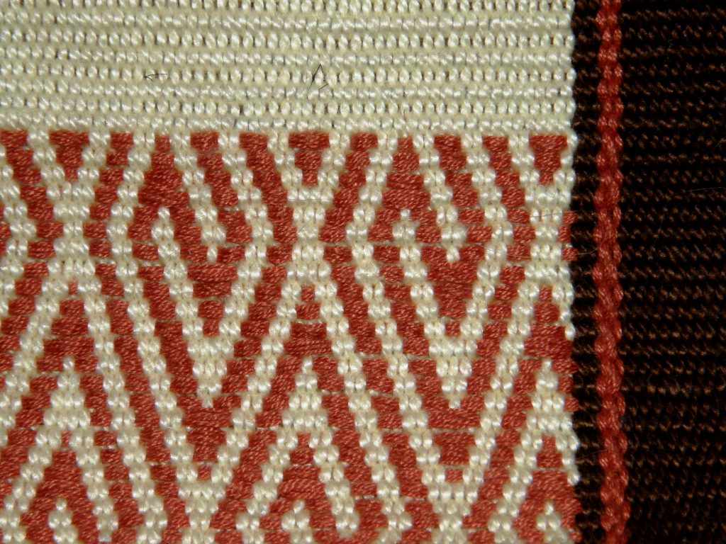La mitad del motivo está terminado. Puedo continuar con el mismo color ó introducir otro. La cola del final de la trama amarilla se va a dejar colgando en la parte de atrás del tejido. Si han empacado la trama firmemente, podrán cortar la cola con seguridad cuando terminen la banda.