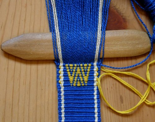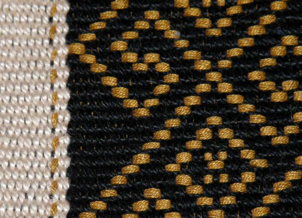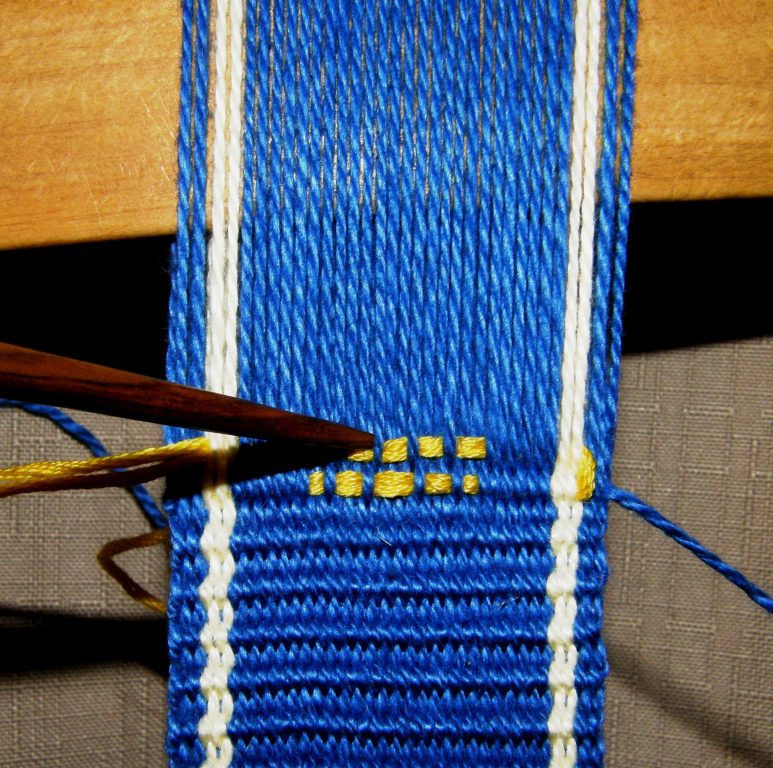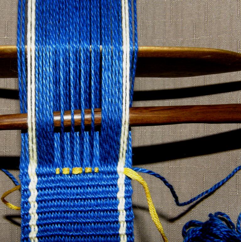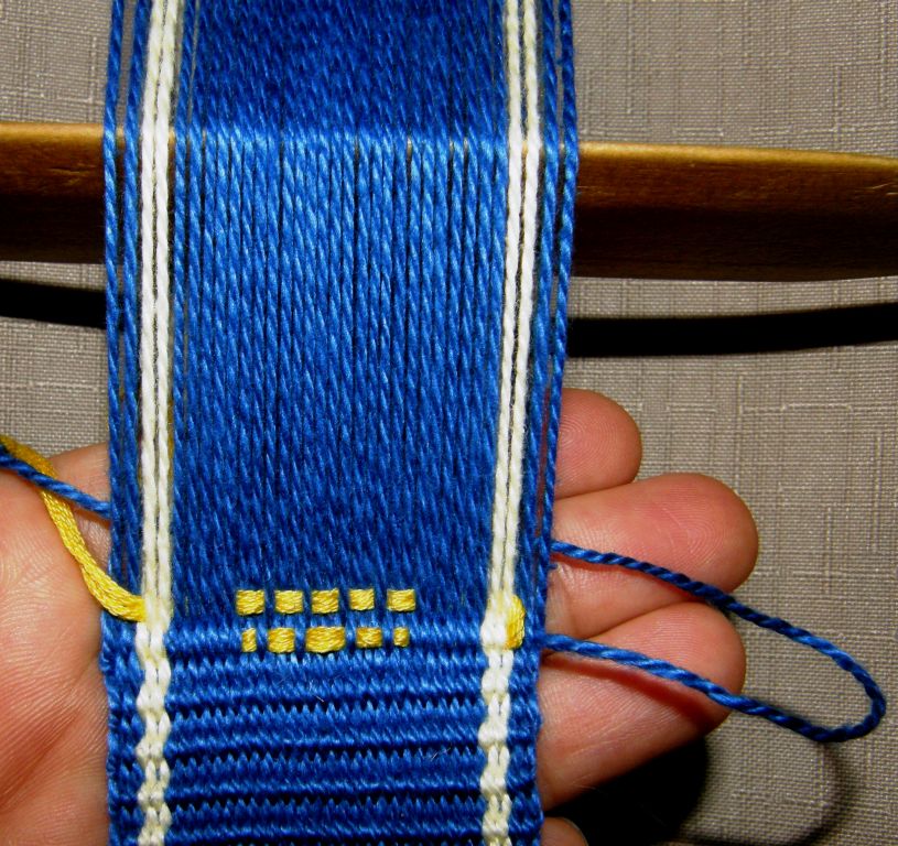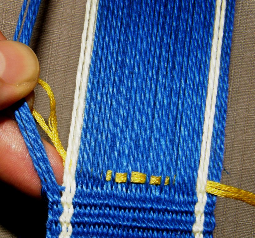 Introducimos el color de nuestra elección como la trama suplementaria con la cual hacemos nuestros patrones. Estoy usando hebras dobles de hilo de bordado que funcionan realmente bien con la base de tejido plano de 24 wpi. La trama suplementaria siempre necesita ser mucho más gruesa que la trama principal. El hilo de bordado es grueso, yace plano y le da una buena cobertura. Al mirar las fotos debajo, verán la diferencia de ancho entre la urdimbre azul y la trama azul y la trama suplementaria amarilla. La trama azul forma la estructura del tejido plano mientras que la amarilla independientemente forma los motivos.