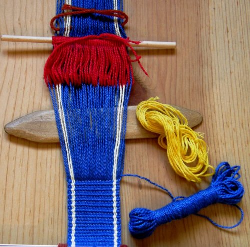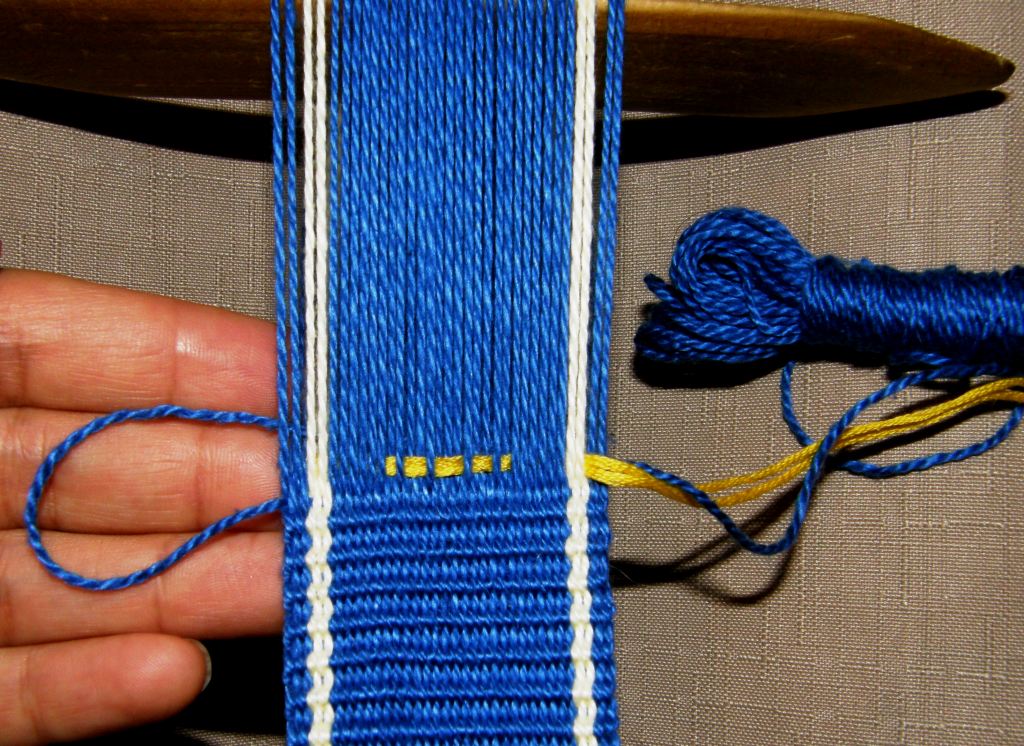 Pasando la trama suplementaria a través de la calada de izquierda a derecha. Estoy separando los hilos para mostrar la cola del comienzo que se deja colgando debajo del tejido y que puede ser cortada cuando se termine la banda. Pueden ver que estoy colocando  la trama suplementaria solo de una raya amarilla de la orilla a la otra en vez de todo a lo largo de la banda.