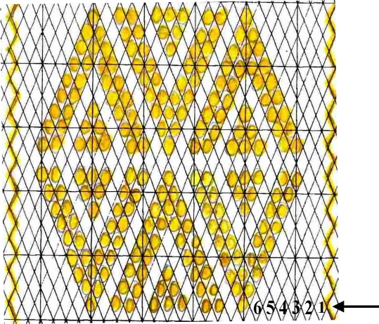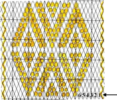 Sin embargo, en esta técnica, los puntos amarillos dentro de los diamantes representan cada urdimbre que necesita ser soltadas para exponer la trama suplementaria.