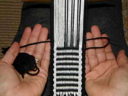 Aquí estoy seleccionado el primer par de urdimbres negras y pasándolo a mi mano derecha. El segundo par, en los dedos de mi mano izquierda, será dejado caer. Continuaré seleccionando el tercer y quinto par y dejaré caer el resto de las urdimbres negras así también como los bordes.