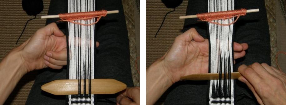 Abran la calada con todas las urdimbres negras, golpeen y pasen la trama.