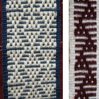 A la izquierda pueden ver la diferencia entre el diseño tejido por medio de urdimbres flotantes simples por debajo y por medio de urdimbres flotantes dobles por encima. Estos han sido tejidos usando el mismo cuadro de patrones.