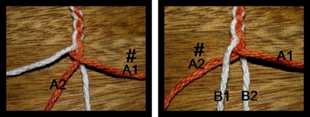 The braid in the center picture has a thread order of B-A-B-A. This simply means that instead of always having two threads of the same color crossing in the center, you will have one thread of each color doing so. The threads shown as A1 and A2 in the first step-by-step picture will be red and white rather than both red.The same goes for the threads shown as B1 and B2….one of each color instead of both white. That will be your starting position and the threads will then cross and move in the same way shown in the tutorial.