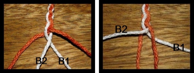 LEFT: Step 5: Strand B2 crosses to the left over the top of strand B1. RIGHT: Step 6: B2 continues moving left over the top of the orange strand while B1 continues moving right under the orange strand. Now the two orange strands are in the middle. This completes the sequence. The orange strands will always cross left over right and the whites right over left.