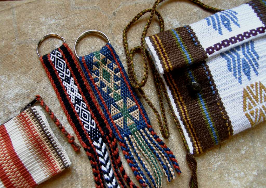 4-strand braids used to finish keyfobs, as edging and a strap for a small purse and as a zip pull on a coin purse. On the keyfobs I didn’t want to finish the braids with bulky knots so I painted the ends with diluted white glue and then pressed the ends together as the glue dried.