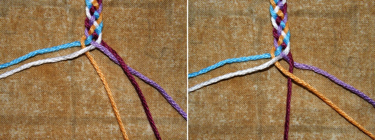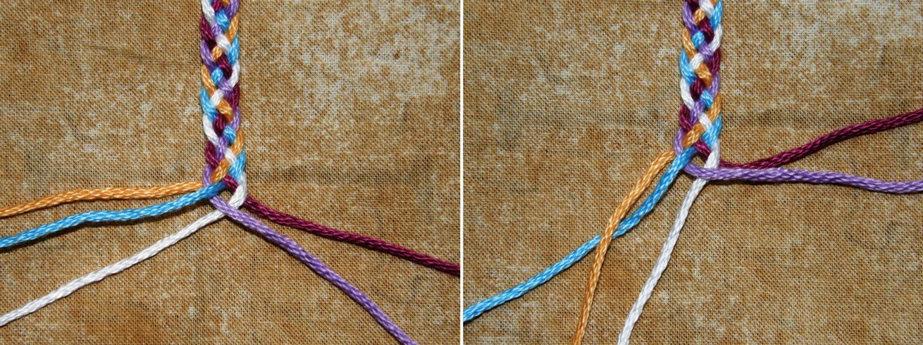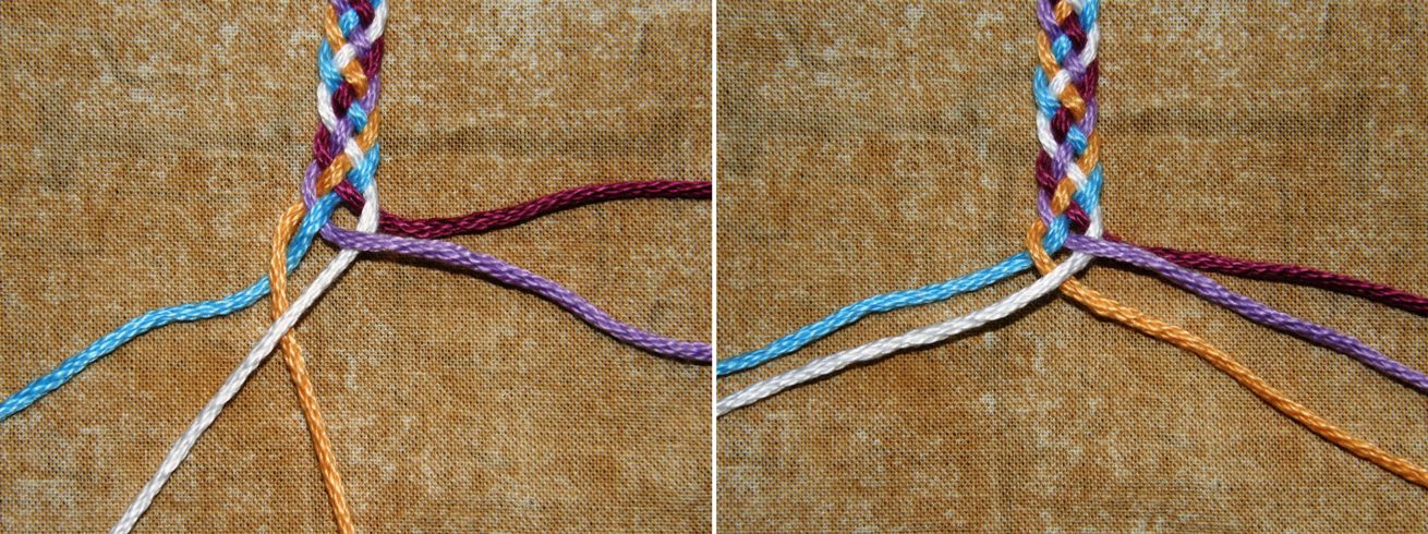 The three strands on the left will be worked just like a three-strand hair braid. The outer strand, in this case the orange one. crosses over the middle strand, in this case the blue one.