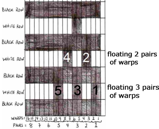 In the videos I am weaving the triangle shown above and show how to float the first three pairs of warps – pairs 1, 3 and 5. The second part of the video shows how to float the second set of warps – pairs 2 and 4.