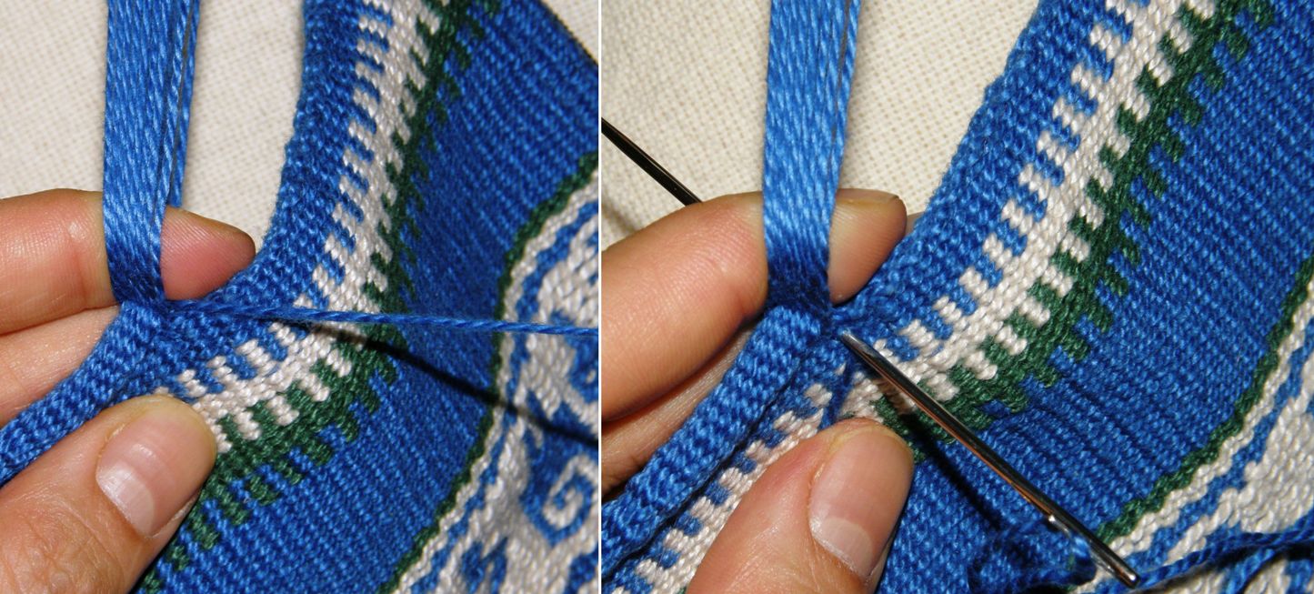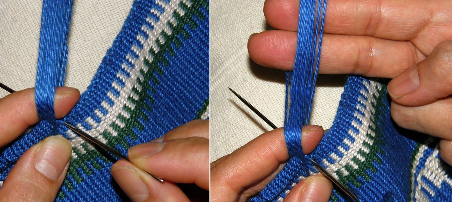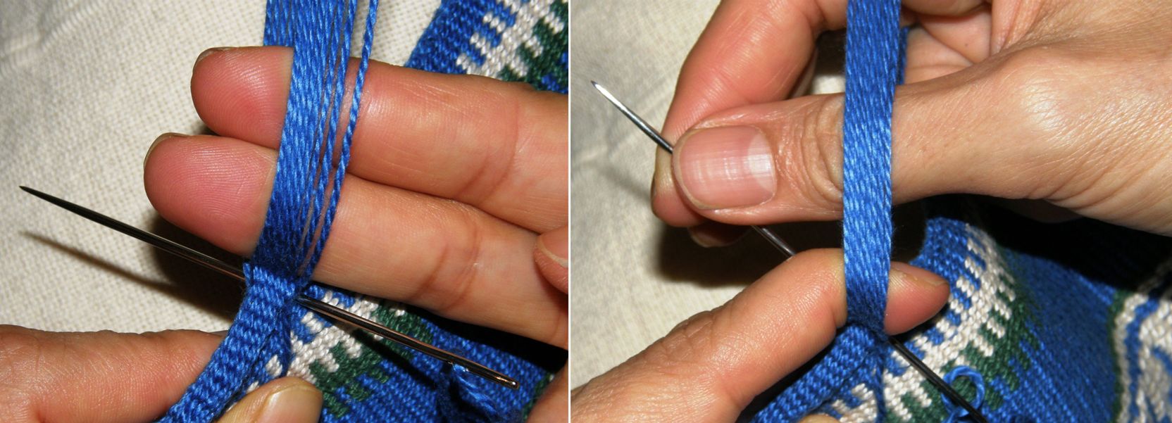 • Decide exactly where you are going to pierce the fabric with the needle (how far away from the edge) and try to stick to that, for example, three warps in from the edge. Check both sides of the fabric to make sure that the band is sitting well on the edge and not too much to just one side. Make sure your needle is passing straight though the cloth and not down at an angle. Keep an eye out for buckling fabric. This is a sign that you may be piercing the fabric too far forward.