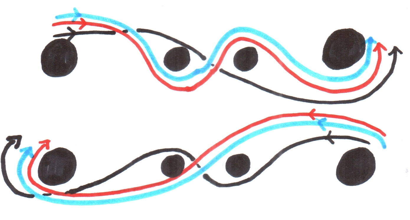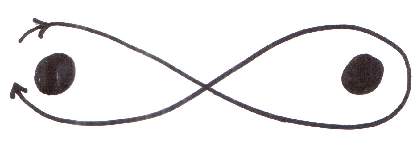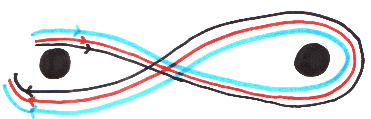 STEP B. Wind two revolutions of red, white and black together …(my picture, which shows one revolution, has red, blue and black threads for obvious reasons!) Try to separate the black thread from the red and white ones by keeping a finger or thumb between them so that they don’t twist.