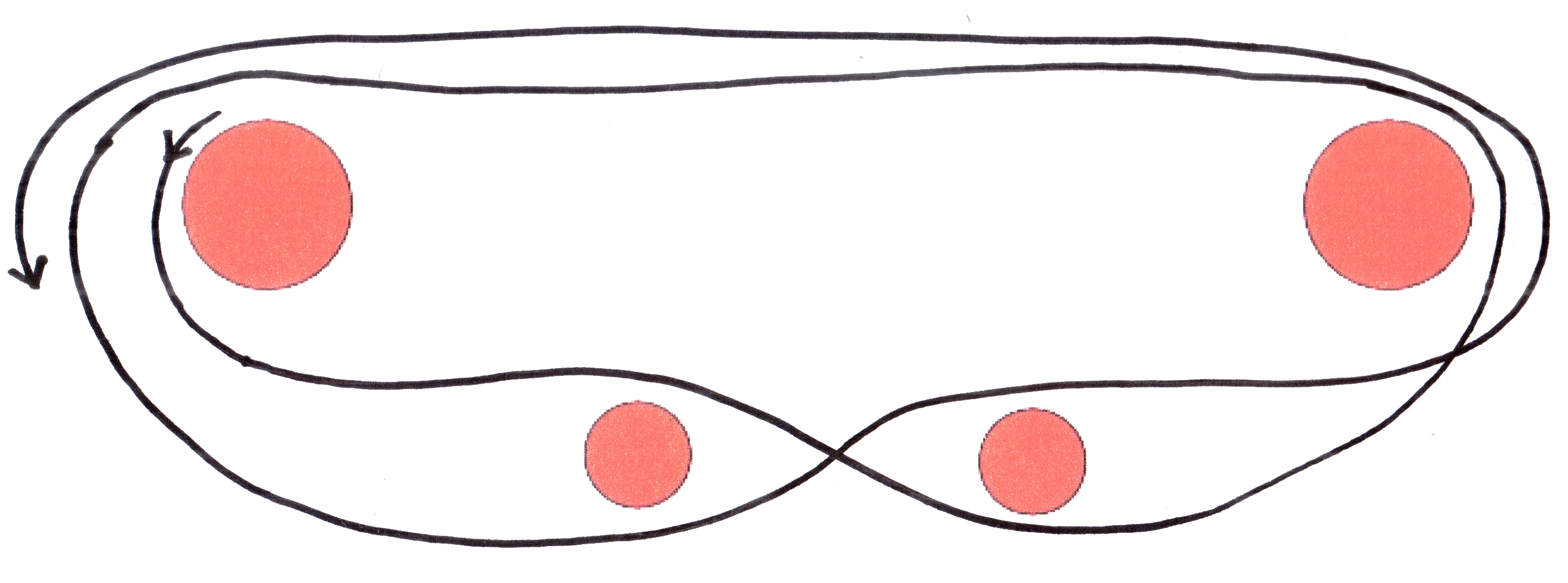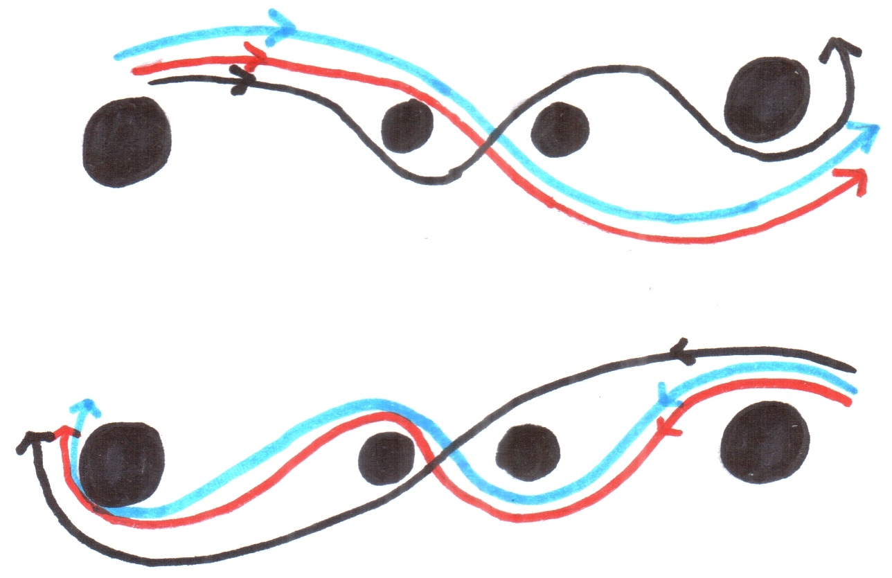 STEP 3: Wind another revolution with the three colors together but, this time, when you reach the cross posts, place the black thread first on stake D and the red and blue on stake C. Turn around stake B and do likewise on the return path…place the black first on stake D followed by the red and blue on stake C as shown below…