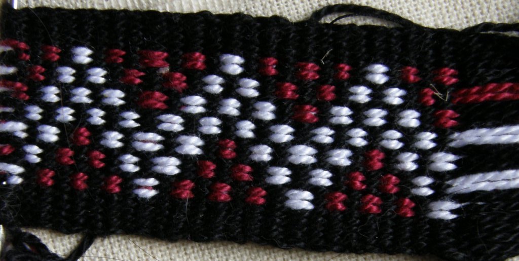 Then wind the other border by tying the border color thread onto the black. You will need to tie off the red and white threads to another warp at the stake where they ended.