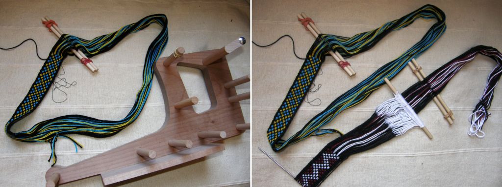 Above left you can see the circular warp that I removed on my inkle loom. When I have finished weaving, the warp will be cut and opened out to its full length. Above right you can see the difference between a circular warp and a single-plane one.