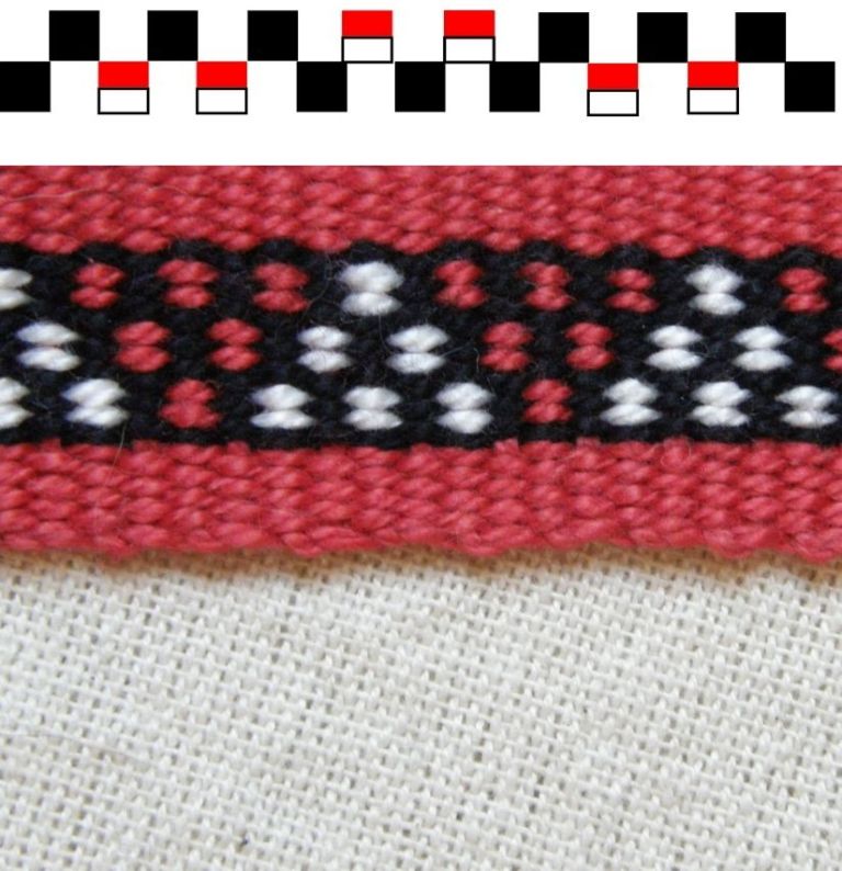The split red and white squares indicate where red and white threads need to be warped together as one and these are the threads that are substituted one for the other when weaving.